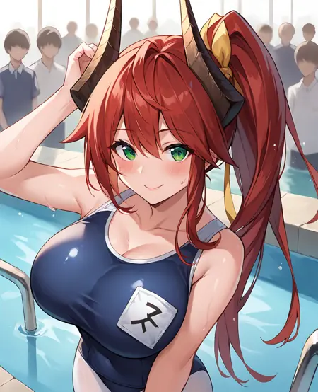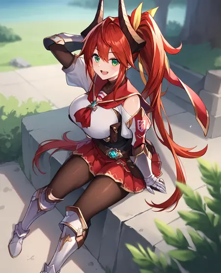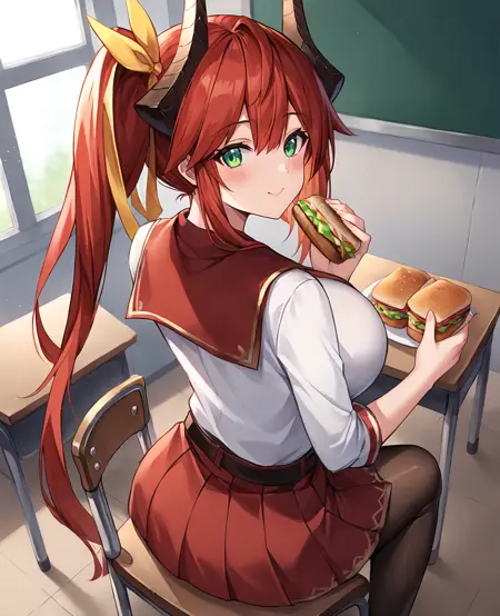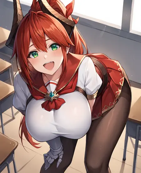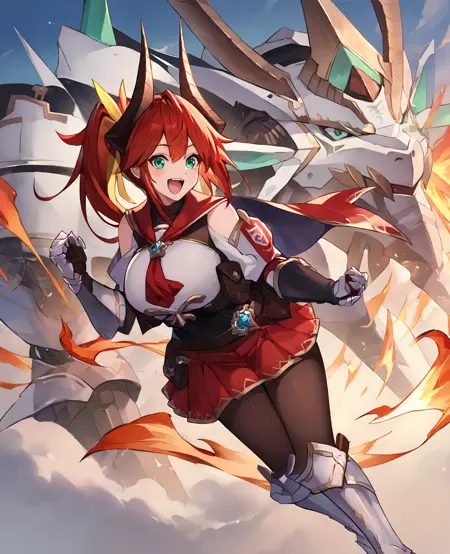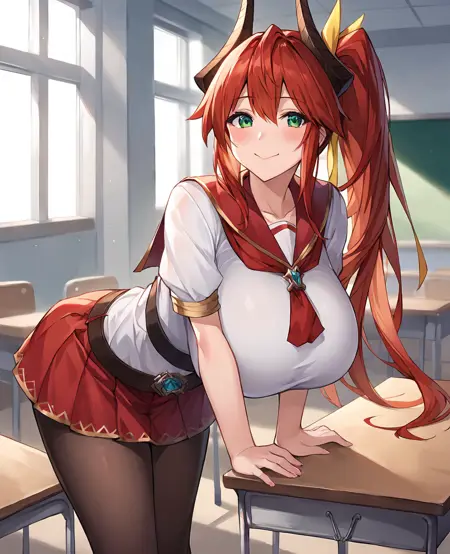 基础:红发,马尾,绿眼,发饰(角),(黄色)发带,(饰品),水手服,水手领,蝴蝶结(领带),白衬衫,肩部/服装镂空,手套/护臂,腰带,口袋/包,(红色)百褶裙,黑色连裤袜,(装甲靴)