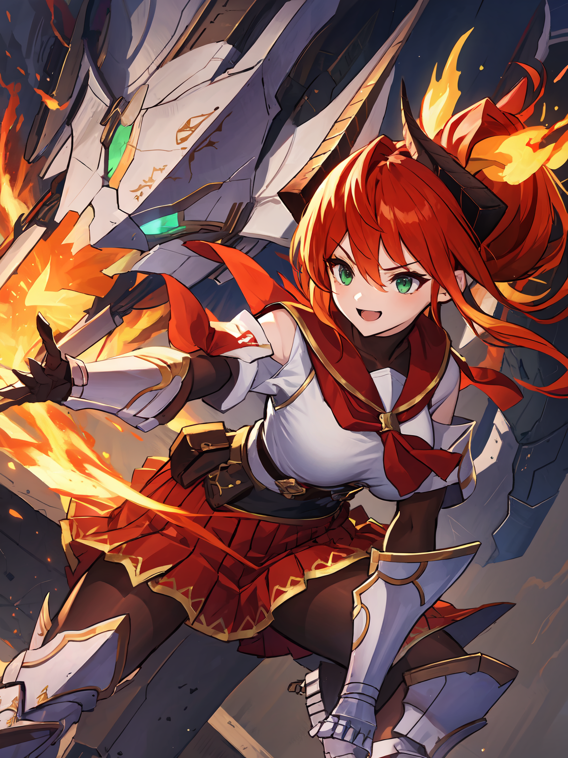 基础:红发,马尾,绿眼,发饰(角),(黄色)发带,(饰品),水手服,水手领,蝴蝶结(领带),白衬衫,肩部/服装镂空,手套/护臂,腰带,口袋/包,(红色)百褶裙,黑色连裤袜,(装甲靴)