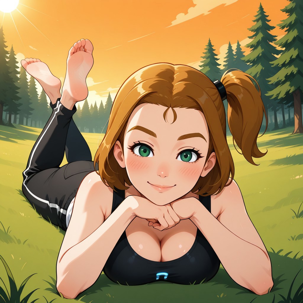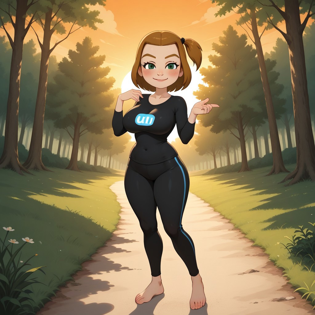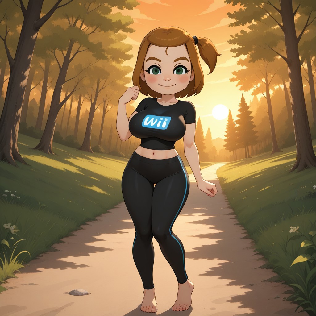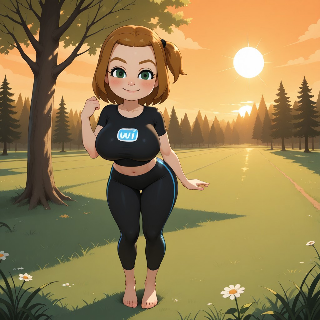 wii, mii, wii sports, 1girl, cute, female mii, dark blonde hair, side ponytail, dark blonde eyebrows, green eyes, blush, black clothing, black pants, shoes, PollyWSC, breasts, nintendo mii, modern_mii, classic_mii