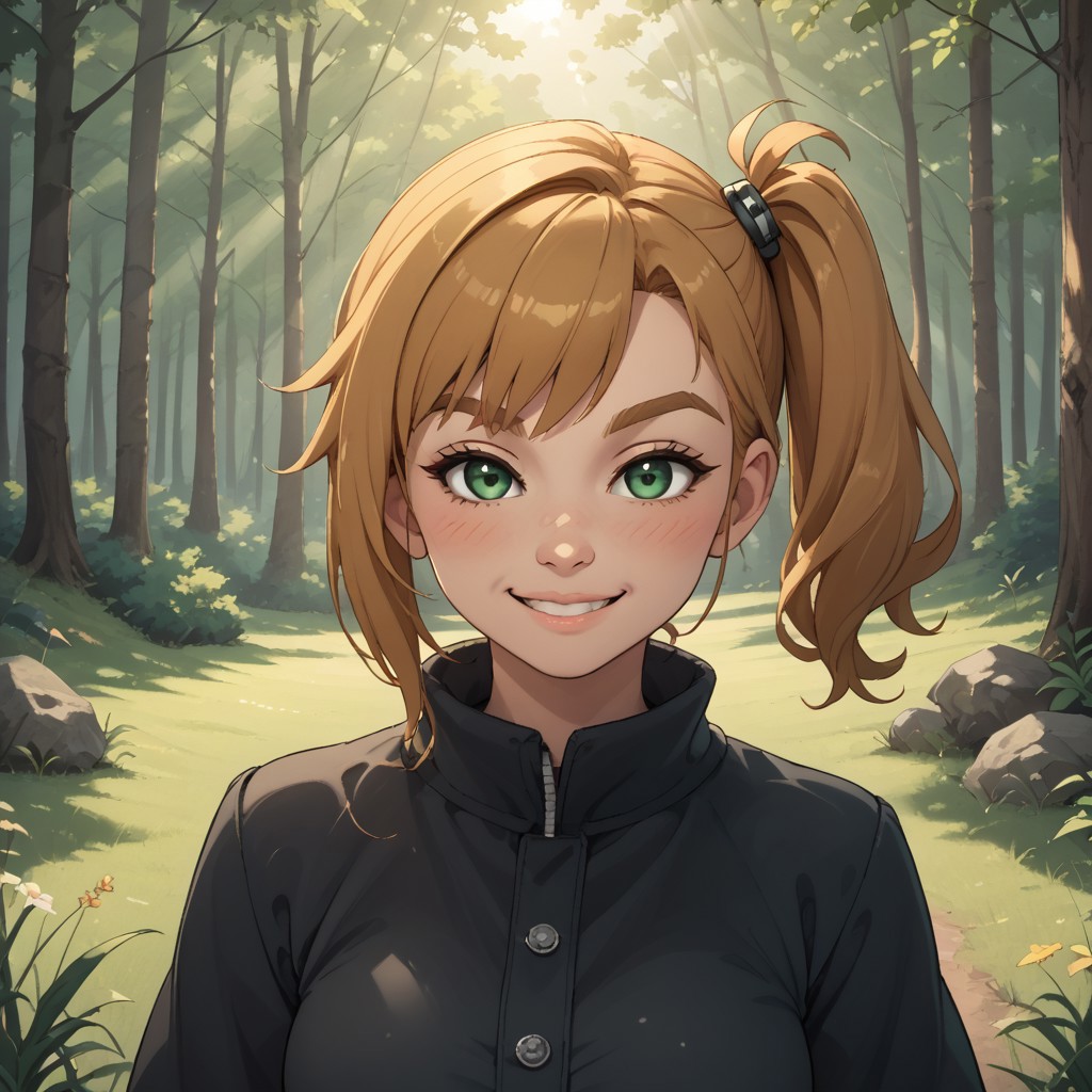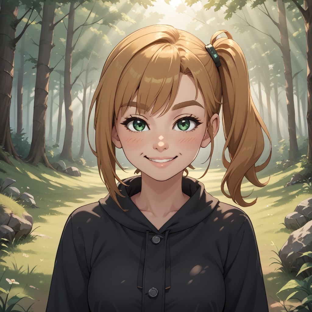 wii, mii, wii sports, 1girl, cute, female mii, dark blonde hair, side ponytail, dark blonde eyebrows, green eyes, blush, black clothing, black pants, barefoot, PollyWSC, breasts, nintendo mii, modern_mii, classic_mii