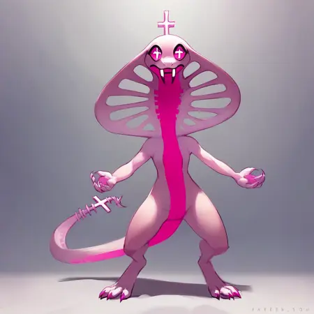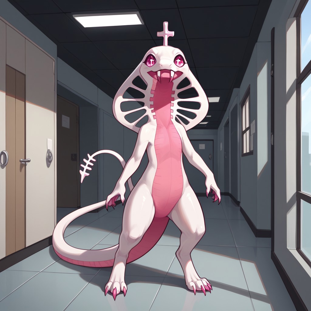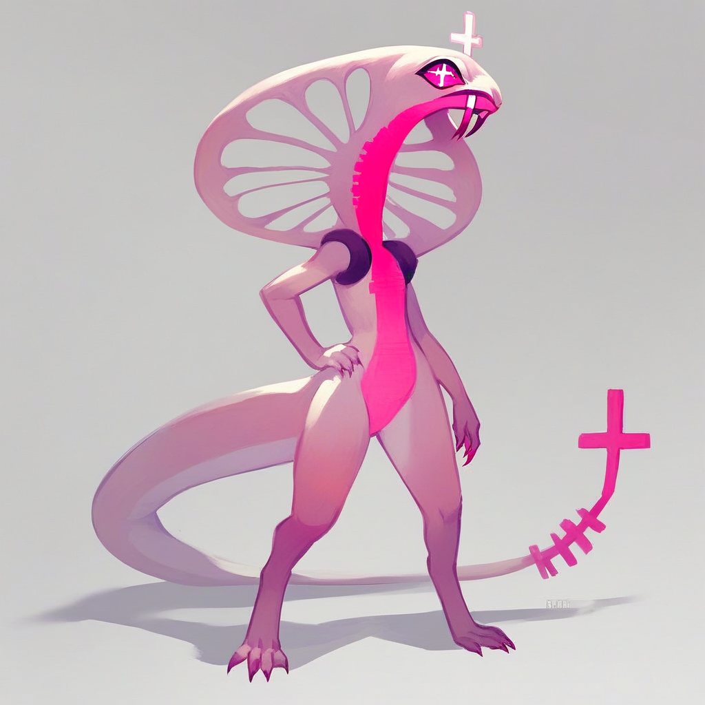Snake girl, anthro, female reptile, white and pink body, holes in snake hood, long tail, pink eyes, cross shaped pupils, head ornament (cross), fangs