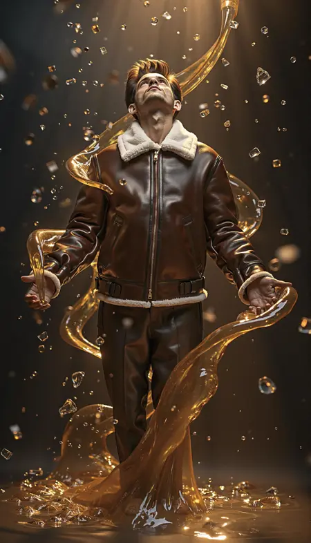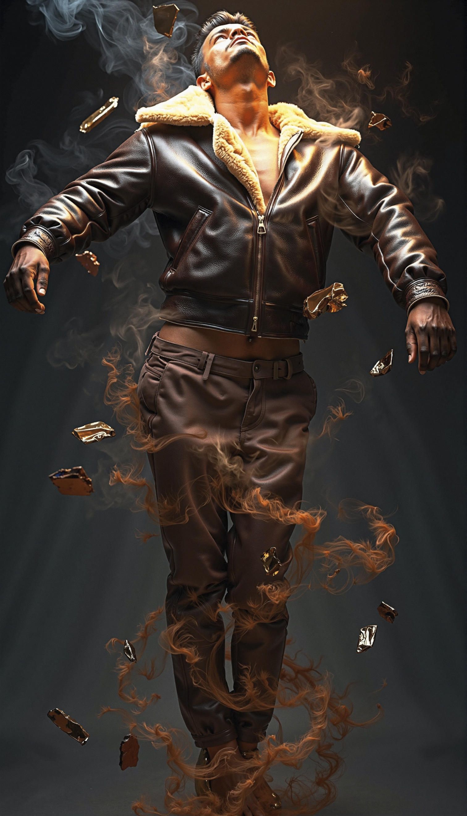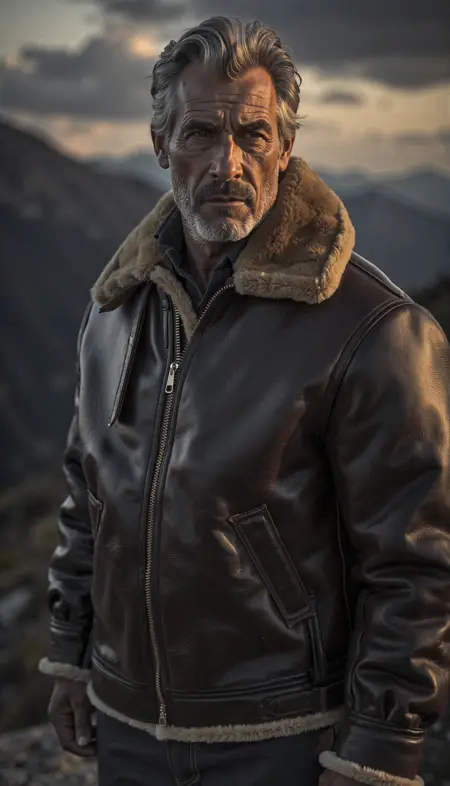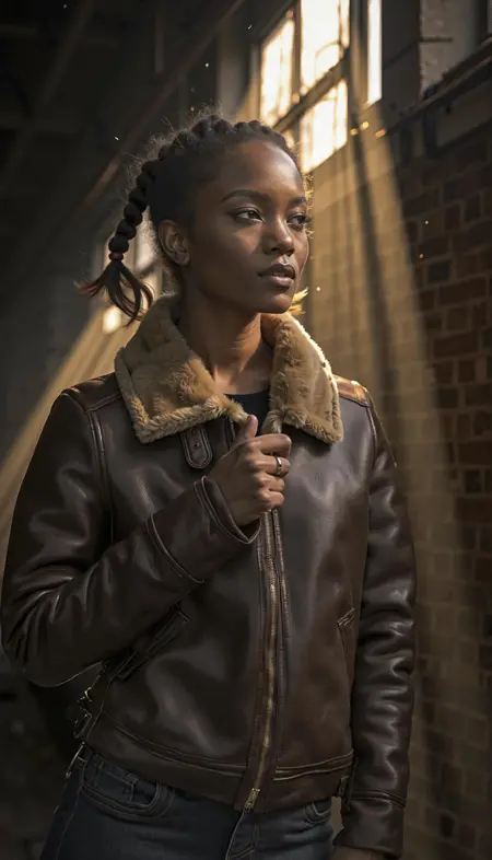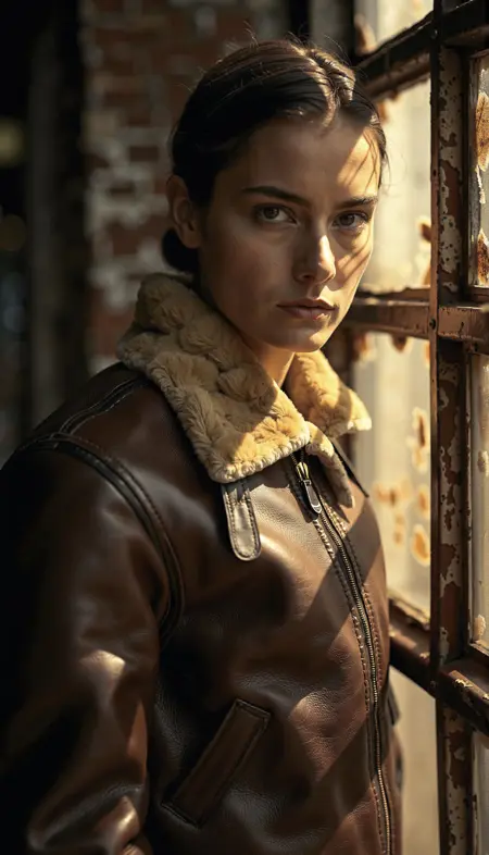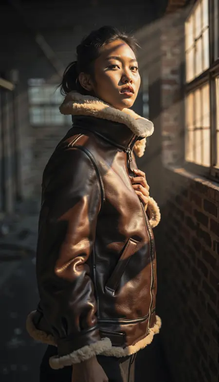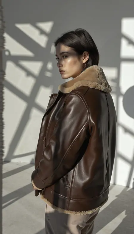 is wearing a brown leather bomber jacket with a shearling collar. The jacket has a combination of dark brown and lighter brown leather, with a snug fit. The sleeves are slightly puffy and have a contrasting leather patch
