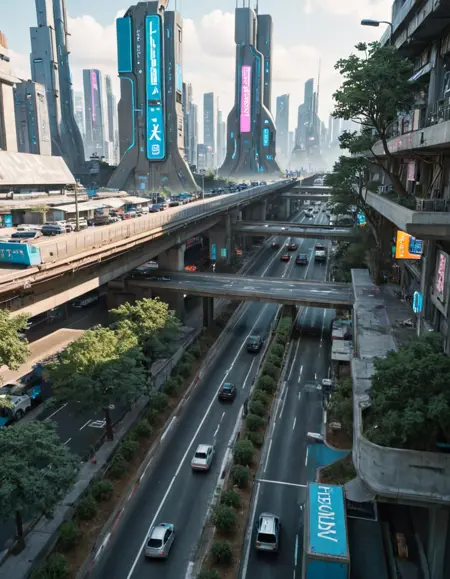 citybkg, cyberpunk, day, ambiance, sunny, clouds, detailed, streets, cars, traffic, futuristic, elevated highway, aerial front view, high buildings, low buildings, river, shore, vegetation, electric pylones, lora:City\_Worlds:1