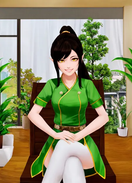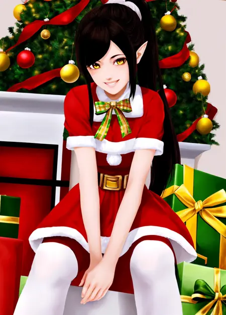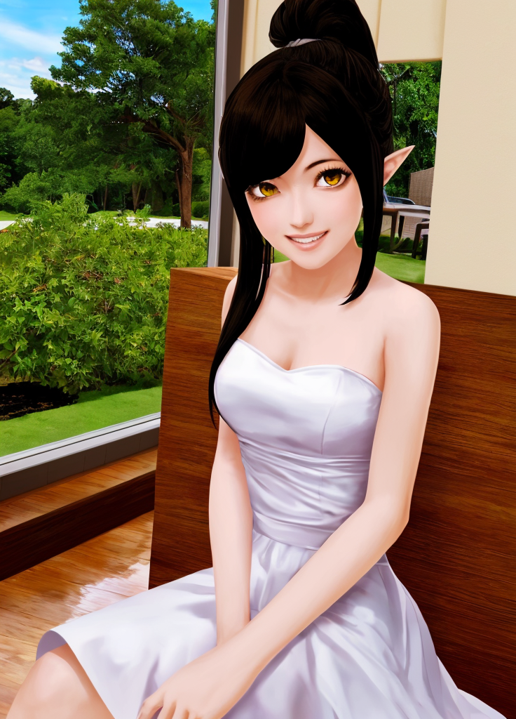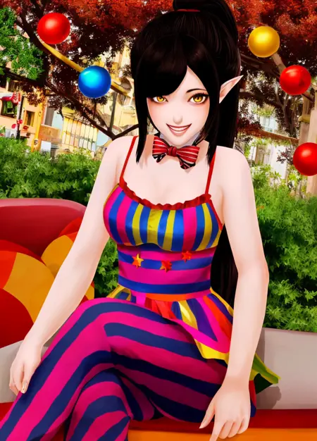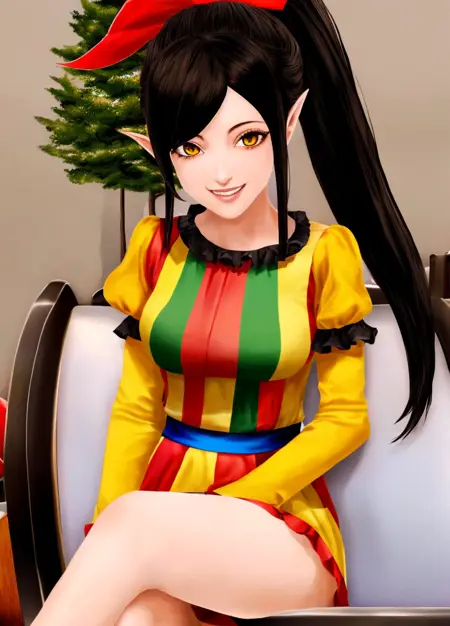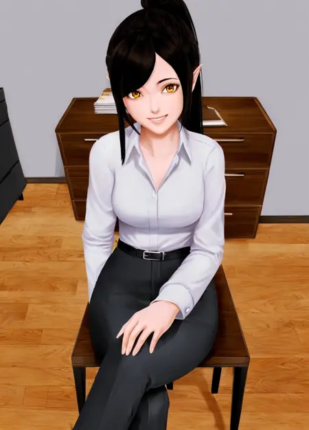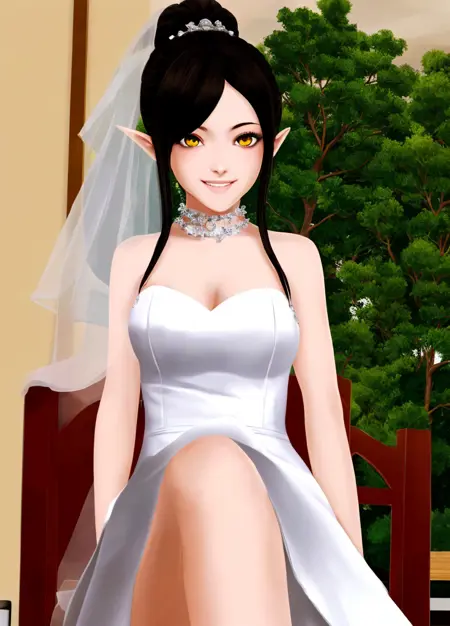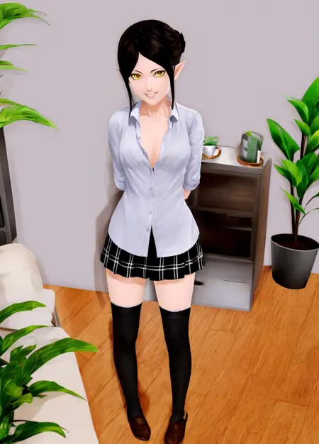 主身体提示词: Harem_Hotel_Lin, 1girl, solo, 长发, 黑发, 中等胸部, 黄色眼睛, 马尾, 尖耳,