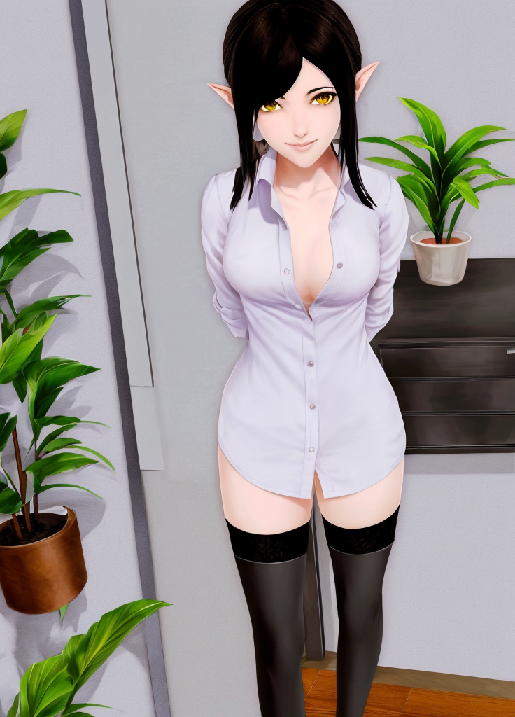 Harem_Hotel_Lin, 1girl, solo, 看向观众, 微笑, 衬衫, 黑发, 过膝袜, 中等胸部, 黄色眼睛, 衣物敞开, 尖耳, 室内, 白色过膝袜, 衬衫敞开, 衬衫, 不穿胸罩, 双手背在身后, 植物, 盆栽, 赤裸上身,