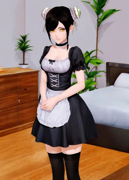 基础提示词(女仆): Harem_Hotel_Lin, 1girl, solo, 长发, 黑发, 中等胸部, 黄色眼睛, 马尾, 尖耳, 项圈, 纯色背景, 女仆头饰, 女仆围裙, 女仆裙, 发髻, 双发髻