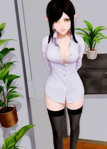 Harem_Hotel_Lin, 1girl, solo, looking at viewer, smile, shirt, black hair, thighhighs, medium breasts, yellow eyes, open clothes, pointy ears, indoors, white thighhighs, open shirt, dress shirt, no bra, arms behind back, plant, potted plant, naked shirt,