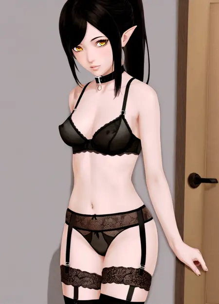 Harem_Hotel_Lin, 1girl, solo, long hair, black hair, thighhighs, navel, medium breasts, underwear, nipples, panties, yellow eyes, ponytail, pointy ears, bra, collar, underwear only, lingerie, garter belt, crotchless, cupless bra, nippleless clothes,