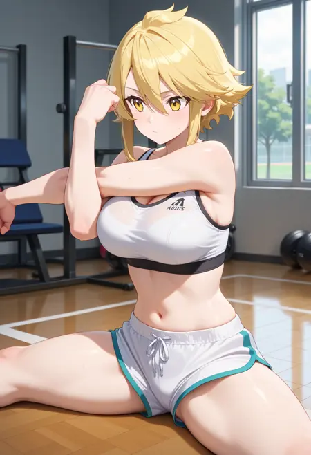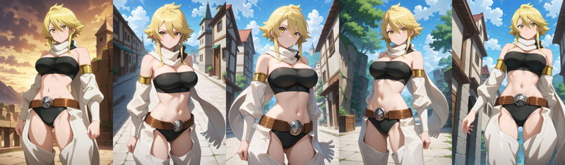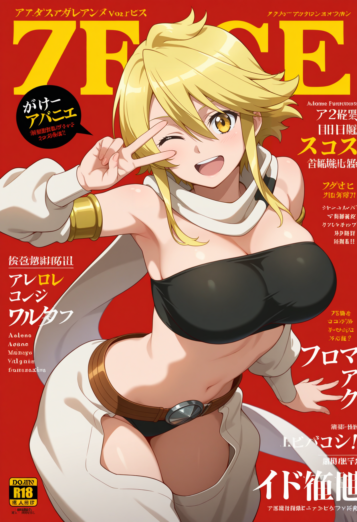 outfit1aaleone, 단발, 금발, 노란 눈, 흰 스카프, 스트랩리스, 검은 튜브탑, 분리형 소매, 허리, 벨트, 검은 팬티, 챕스, 흰 바지