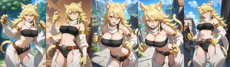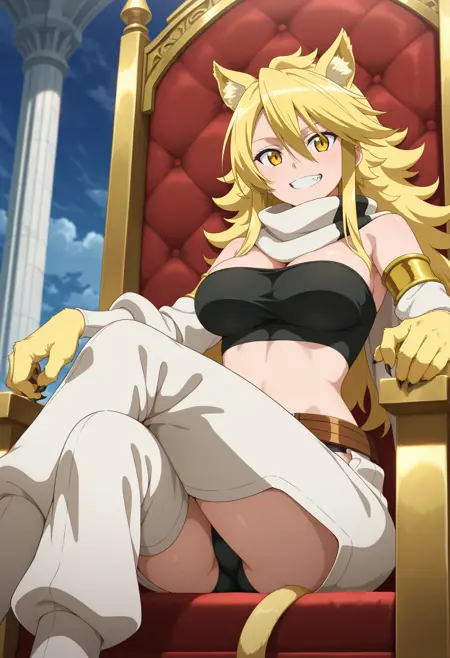 outfit2aaleone, 긴 머리, 금발, 동물 귀, 노란 눈, 송곳니, 꼬리, 흰 스카프, 스트랩리스, 검은 튜브탑, 분리형 소매, 동물 손, 허리, 벨트, 검은 팬티, 챕스, 흰 바지