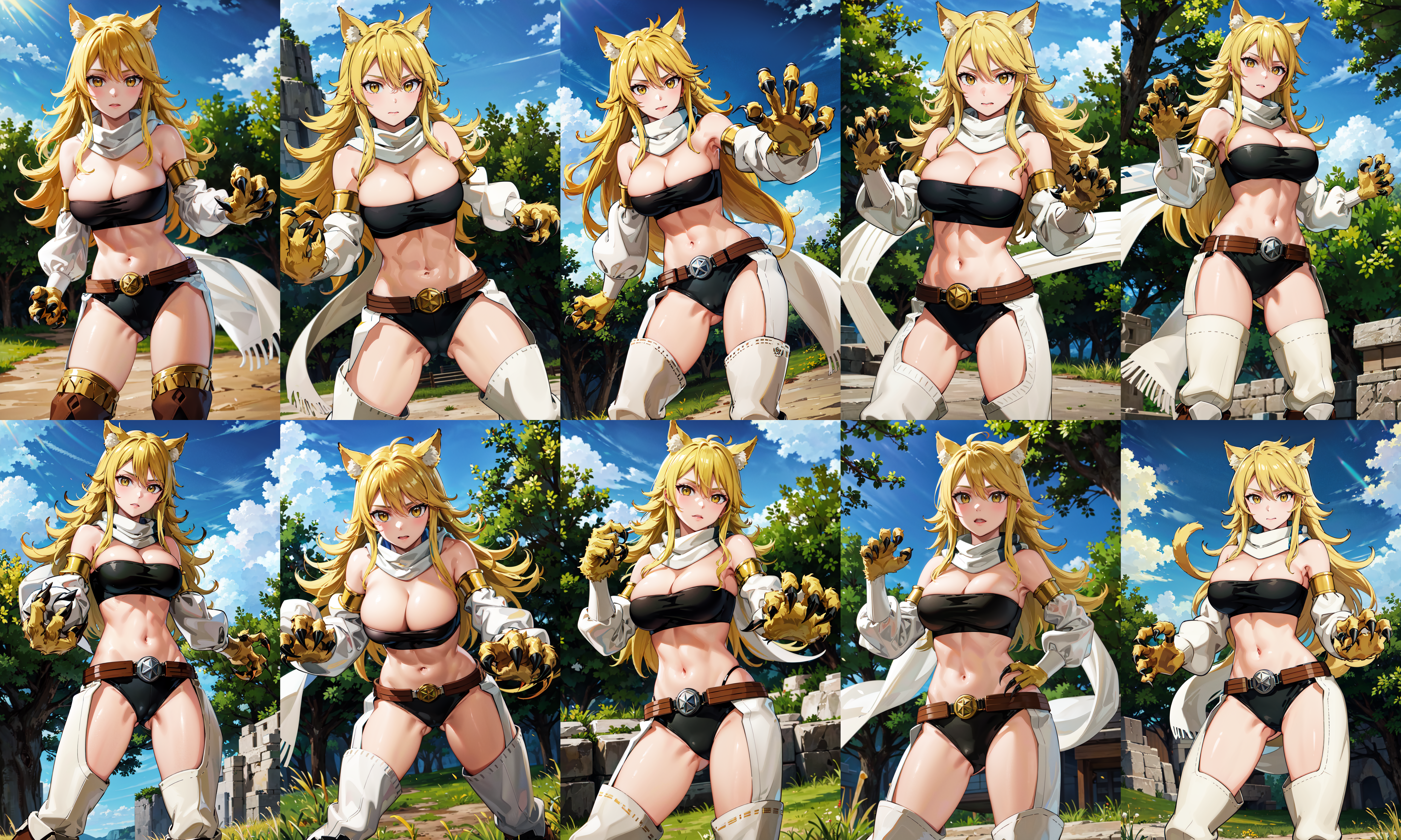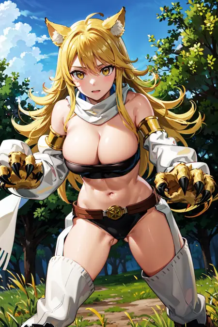 outfit2aaleone, long hair, blonde hair, animal ears, yellow eyes, fang, tail, white scarf, strapless, black tube top, detached sleeves, animal hands, midriff, belt, black panties, chaps, white pants