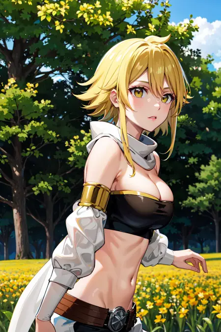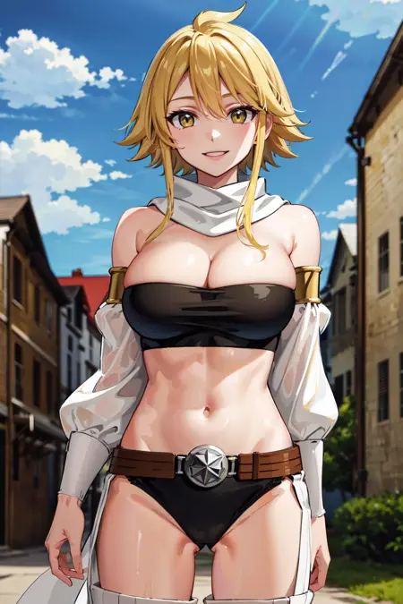 outfit1aaleone, short hair, blonde hair, yellow eyes, white scarf, strapless, black tube top, detached sleeves, midriff, belt, black panties, chaps, white pants