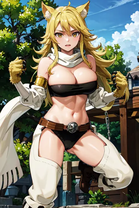 outfit2aaleone, long hair, blonde hair, animal ears, yellow eyes, fang, tail, white scarf, strapless, black tube top, detached sleeves, animal hands, midriff, belt, black panties, chaps, white pants
