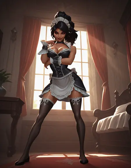xnidaleex, league of legends, black hair, long hair, ponytail, brown eyes, dark-skinned female, makeup, lipstick, forehead jewel