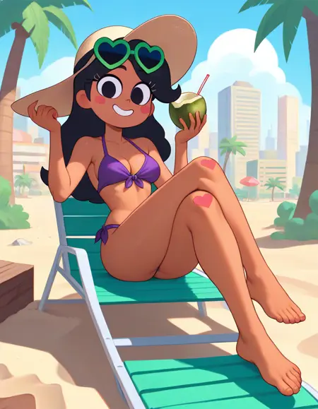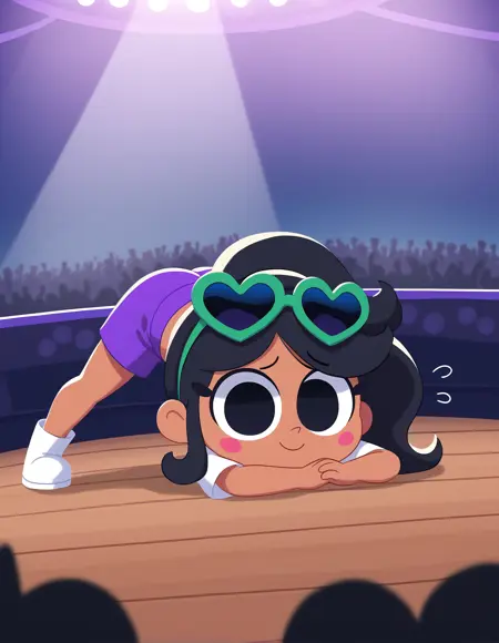 anittinha, blush stickers, white shirt, purple shorts, heart sunglasses on head, heart on knees, midriff