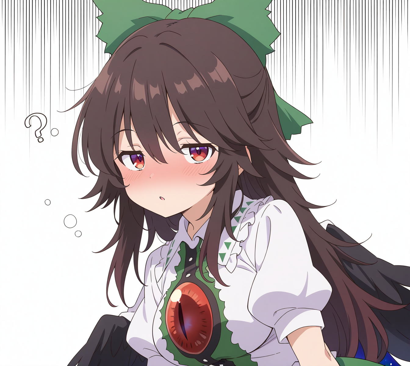 reiuji utsuho, 1girl, solo, brown hair, green bow, hair bow, black wings, bird wings, third eye, medium large breasts,
