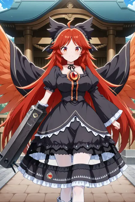 reiuji utsuho, 1girl, solo, red eyes, red hair, long hair, ahoge, sidelocks, orange wings, third eye, breasts,, reiuji utsuho \(the tiny queen's charcoal maker\), alternate costume, alternate hair color, hair bow, black bow, black hairband, frilled hairband, hair ornament, black cape, black choker, black bowtie, green pendant, black dress, layered dress, frilled dress, puffy sleeves, asymmetrical sleeves, mismatched sleeves, wide sleeves, frilled sleeves, gold trims, crinoline, chain, detached skirt, white thighhighs, asymmetrical footwear, mismatched footwear, white socks, black shoes, torn arm cannon, black arm cannon,
