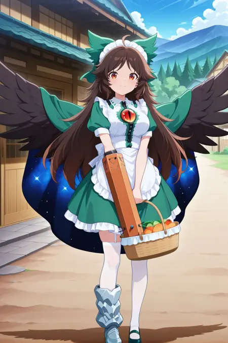 reiuji utsuho, 1girl, solo, brown eyes, brown hair, long hair, ahoge, black wings, bird wings, third eye, breasts, reiuji utsuho \(palace of the earth spirits' feathered helper\), alternate costume, hair bow, green bow, maid headdress, green dress, maid apron, frilled apron, white apron, green cape, starry sky print, white thighhighs, green shoes, asymmetrical footwear, holding basket, arm cannon,