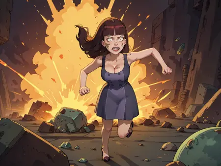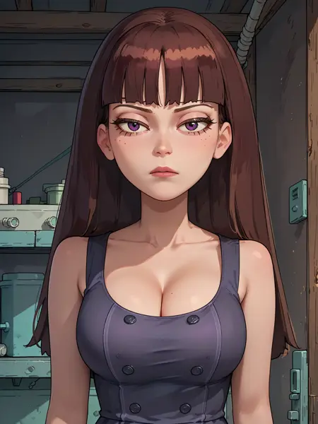 追加要素: 1girl, solo, large breasts, brown hair, long hair, blunt bangs, purple dress, bare shoulders, cleavage, high heels