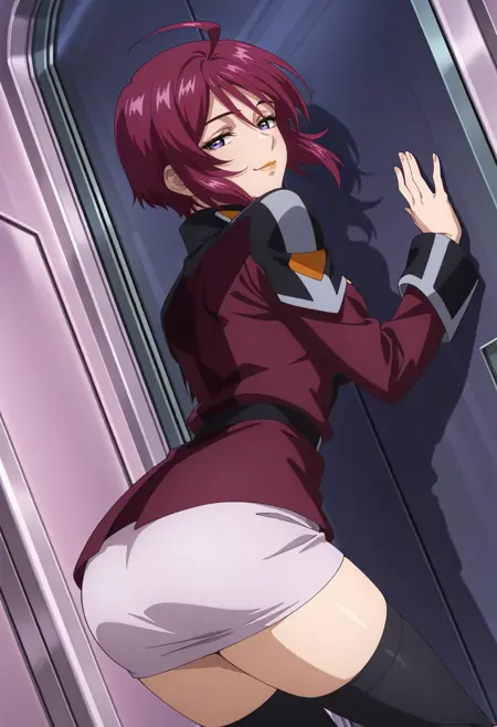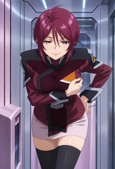 베이스: lunamaria_h, 1girl, 애니메이션 컬러링, 싱글, 단발, 빨간 머리, ahoge, 눈 사이의 머리카락, 보라색 눈, 나침반 유니폼, 립스틱, 빨간 재킷, 핑크 미니스커트, 긴 소매, 검은 허벅지 양말, 연필 스커트, 벨트, 젯사이 리ョ우이키, 중간 크기 유방