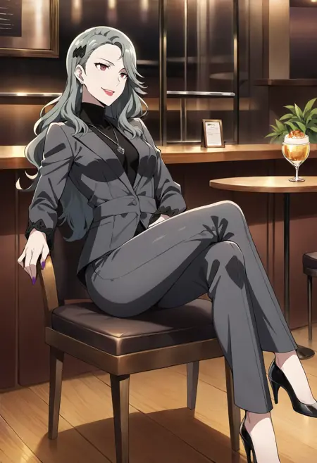 p5sae-default, pendant, grey pant suit, formal, turtleneck, suit, purple nail polish, black high heels,