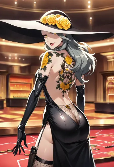 p5sae-cognitive, yellow eyes, hat, hat flower, yellow rose, spiked collar, dress, backless dress, elbow gloves, black lips, makeup, black eyeliner, fishnet thighhighs, garter strap, thigh holster, tattoo, back tattoo,
