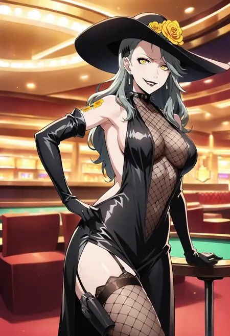 p5sae-cognitive, 黄色眼睛, 帽子, 帽子上的花, 黄玫瑰, 尖刺领圈, 连衣裙, 露背连衣裙, 肘部手套, 黑色嘴唇, 妆容, 黑色眼线, 鱼网丝袜, 吊袜带, 大腿枪套, 纹身,