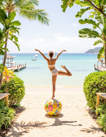 a photo of a golden retriever sitting on a white and pink striped surfboard, wearing a wide-brimmed straw hat and pink sunglasses, surrounded by crystal clear turquoise water and a serene blue sky in the style of gray-malin