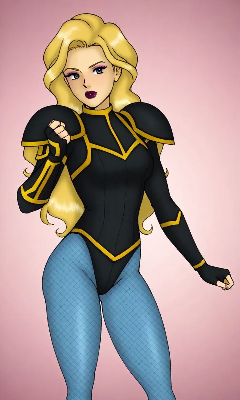 1girl,blonde hair,blue eyes,makeup,yellow shoulder pads,black leotard,yellow trim,long sleeves,fingerless gloves,fishnet pantyhose,blue pantyhose