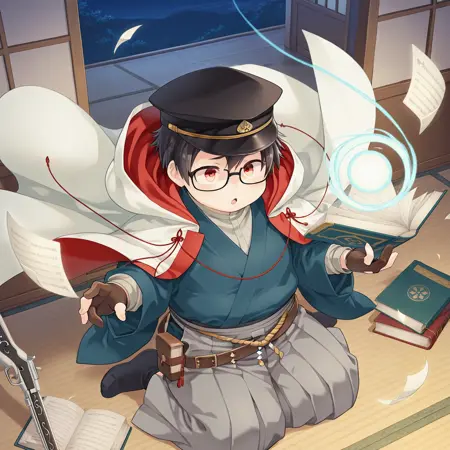 peaked cap, two-sided hooded cloak, japanese clothes, blue kimono, partially fingerless gloves, shimenawa, loose belt, grey hakama, black tabi, geta sandals,