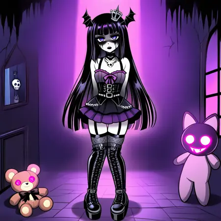 ゴシックスタイルのキャラクター。ゴティックヒックと彼女の Teddy。この二人は何か特別な絆を持っている。彼らはほとんど常に一緒にいたがっている。これは私が作成したキャラクターですが、とてもかっこいいと思っています。どう思いますか?この荘厳なバージョンは、SDXL1.0 よりはるかに素晴らしく、クールです。
