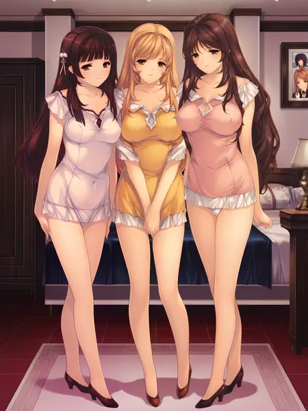 프롬프트: lora:Oyako_Rankan_Illustrious:0.8,3girls,saya and kotone,large breasts,ririko,medium breasts,min-naraken,indoors,full body,standing,seductive smile,group picture,casual,
