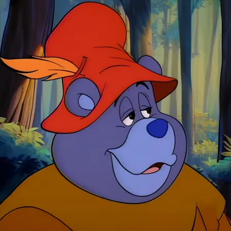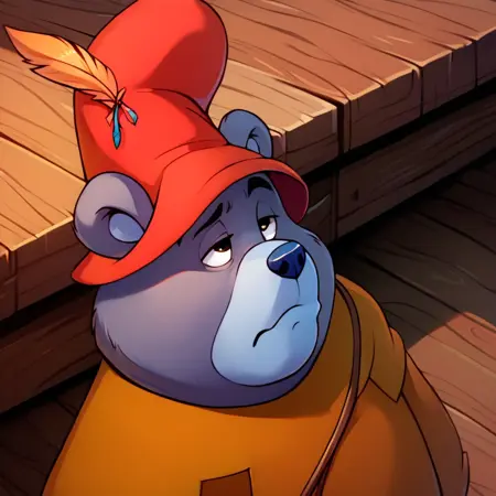 Main prompt tags: tummigummixl, anthro, solo, male focus, bear, brown tunic, red cap with feather <----------- should always be included
