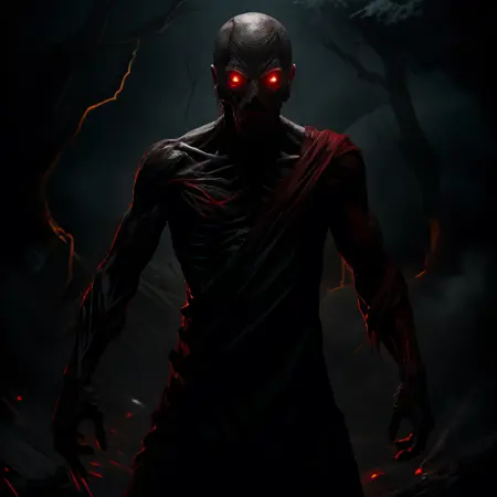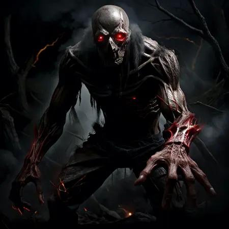 1boy, bald, blurry, claws, crawling, depth of field, empty eye sockets, ghast, glowing, glowing eyes, looking at viewer, male focus, open mouth, reaching out, red eyes, solo, standing