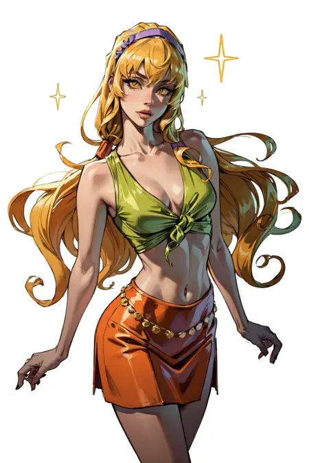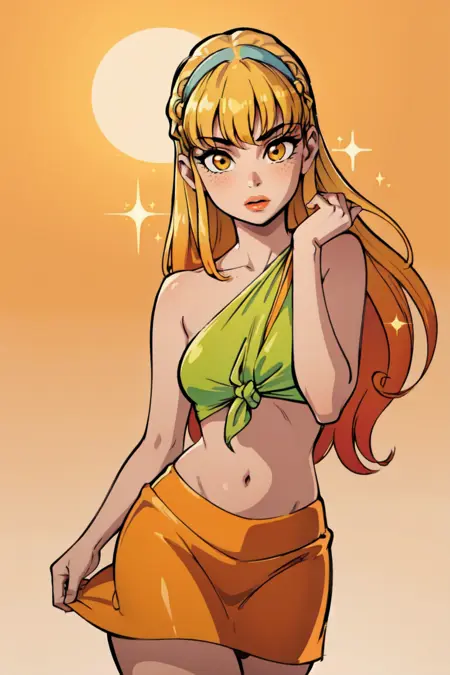 カジュアル服: (CasualOutfit), (ロングヘア、パープルのヘアバンド、グリーンの結び目トップ、オレンジのスカート、サンダル)