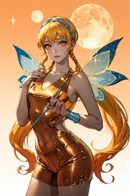 요정 복장: (FairyOutfit), (두 갈래 꼬리, 긴 아래쪽 꼬리, 요정 날개, 주황색 복장, 반짝이는 옷, 빛나는 의상)