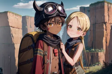 2. Riko, delver outfit, delver helmet, red whistle; Reg, aubade helmet, aubade cape, backpack; the forest of temptation