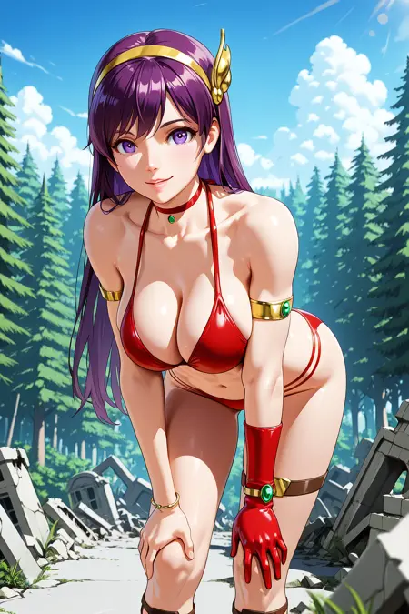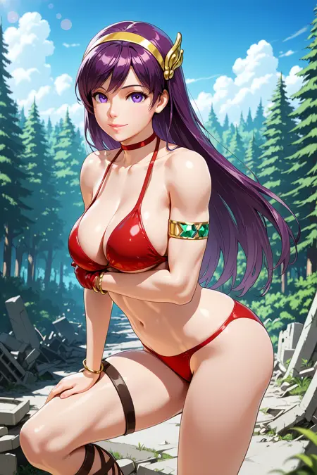 (very_long_hair, cleavage, purple_eyes, purple_hair, yellow_hairband, hair_ornament),