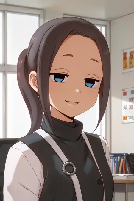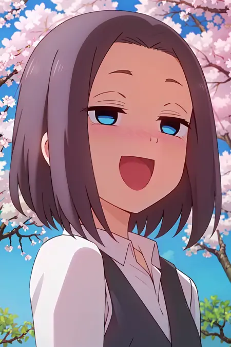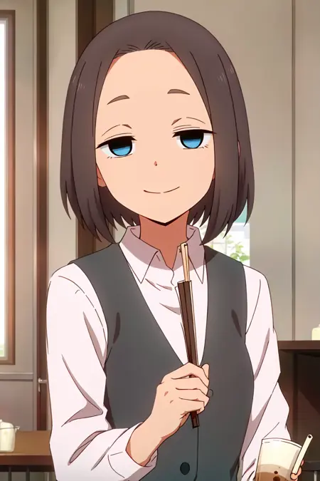 Mona, blue eyes, brown hair, short hair, vest, expressionless, office lady, white shirt, empty eyes, collared shirt,