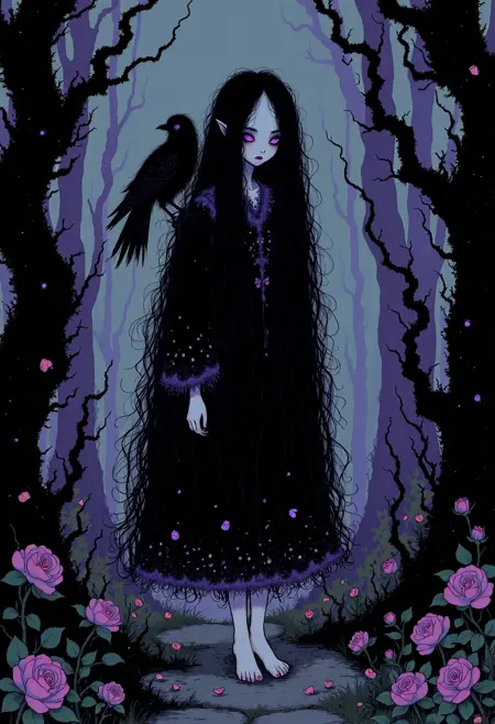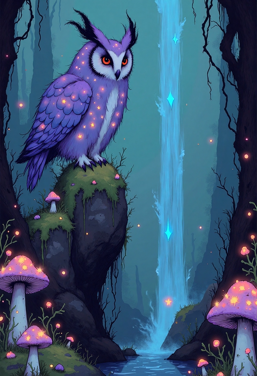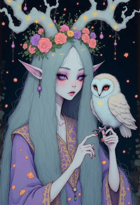 in the style of ppWhimsy, a tranquil woodland scene featuring a woman with flowing white hair and elegant antlers, gently brushing the feathers of a majestic owl perched on her arm, surrounded by glowing mushrooms and soft pink blossoms