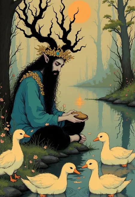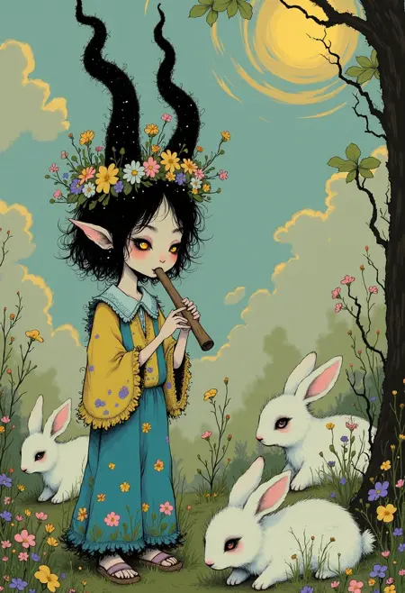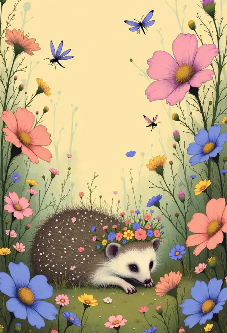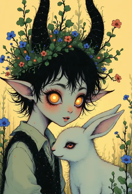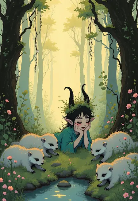 in the style of ppWhimsy, a close-up of a boy with a crown of ferns and tiny horns, his eyes wide with wonder as a family of glowing hedgehogs nestle in his hands, their spines shimmering with soft pastel colors