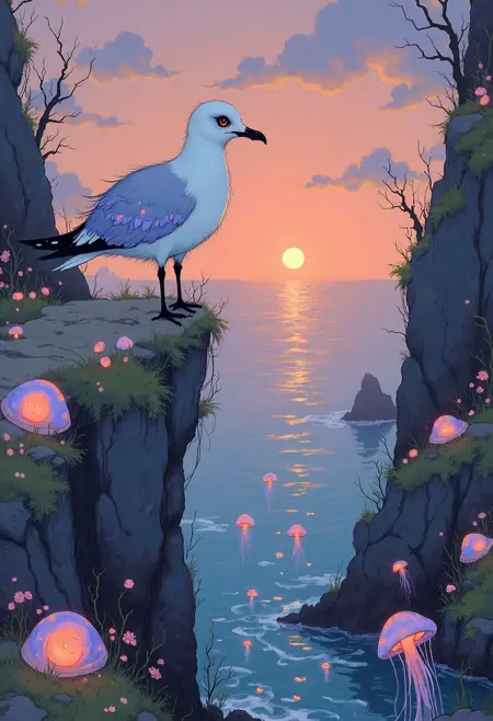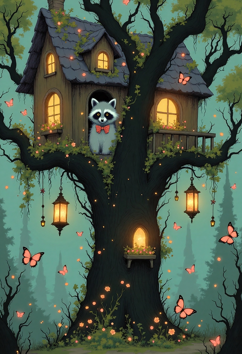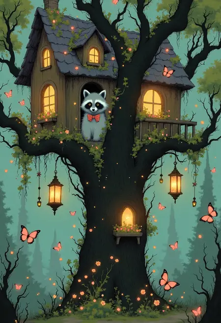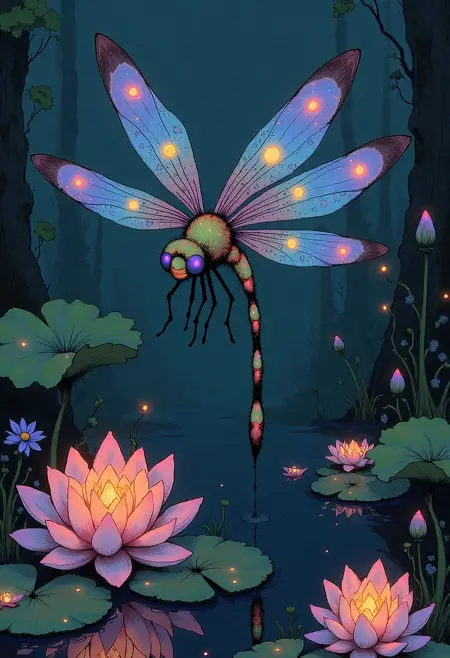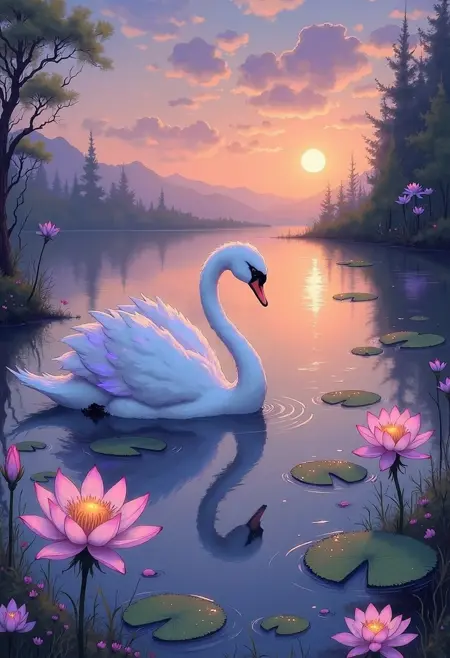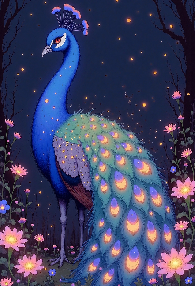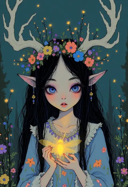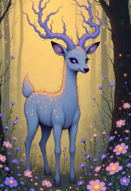 in the style of ppWhimsy, a magical meadow bathed in golden sunlight, where a graceful deer with shimmering silver fur and glowing blue eyes stands amidst a field of glowing, bioluminescent flowers, their petals radiating soft hues of pink and lavender, while tiny fireflies dance around, creating a dreamy, otherworldly atmosphere