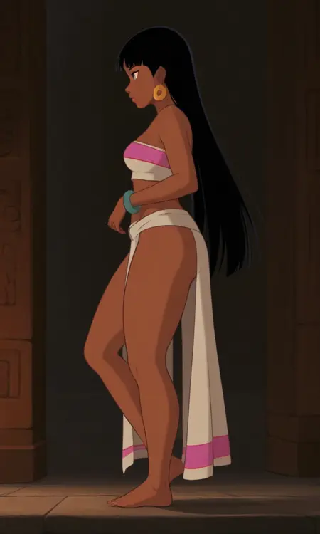 Che1_R, 1girl, solo, dark skin, dark-skinned female, black hair, long hair, bangs, hips, jewelry, earrings, pelvic curtain, tube top, strapless, loincloth, barefoot, standing, looking at viewer, full body