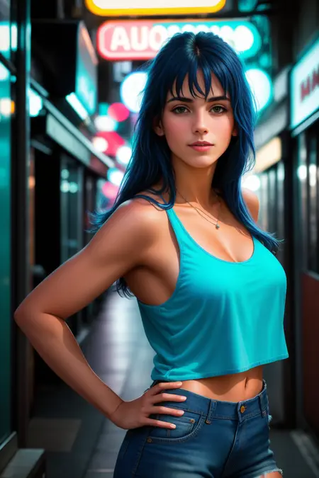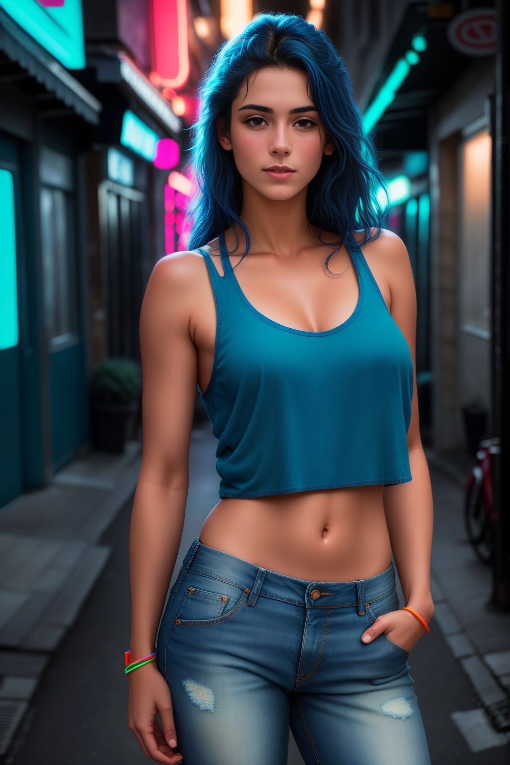 RAW写真、美しい20歳のフランス人女性、タンクトップとブルージーンズを着て、ネオンライトの路地に立っている、((腕を背中に回す)) ((高精細な肌:1.2))、8k UHD、DSLR、ソフトライティング、高品質、フィルムグレイン、Fujifilm XT3