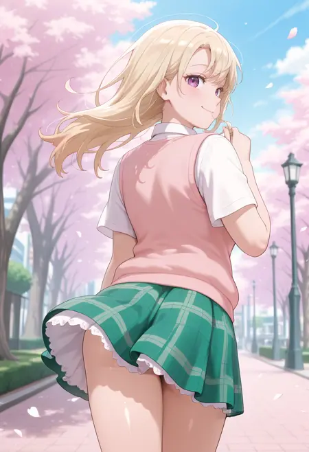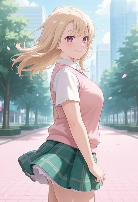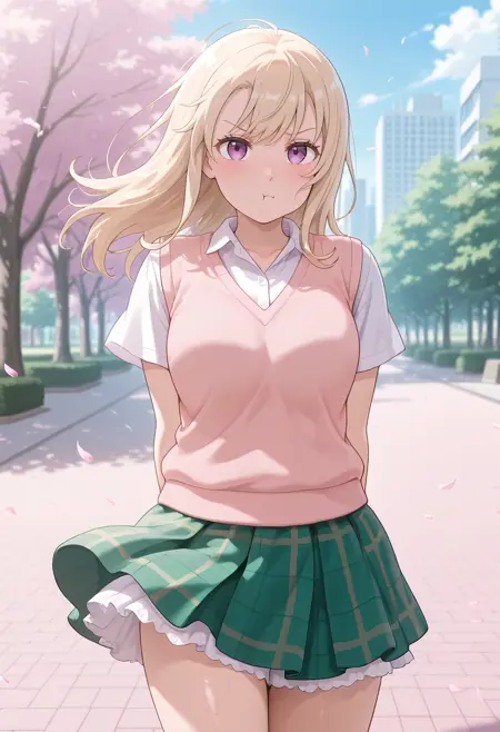 kawaiimona, 1girl, long hair, blonde hair, purple eyes, shirt, white shirt, collared shirt, collared shirt, skirt, plaid yellow, plaid skirt, short sleeves, pink sweater vest, green skirt, petticoat, miniskirt.