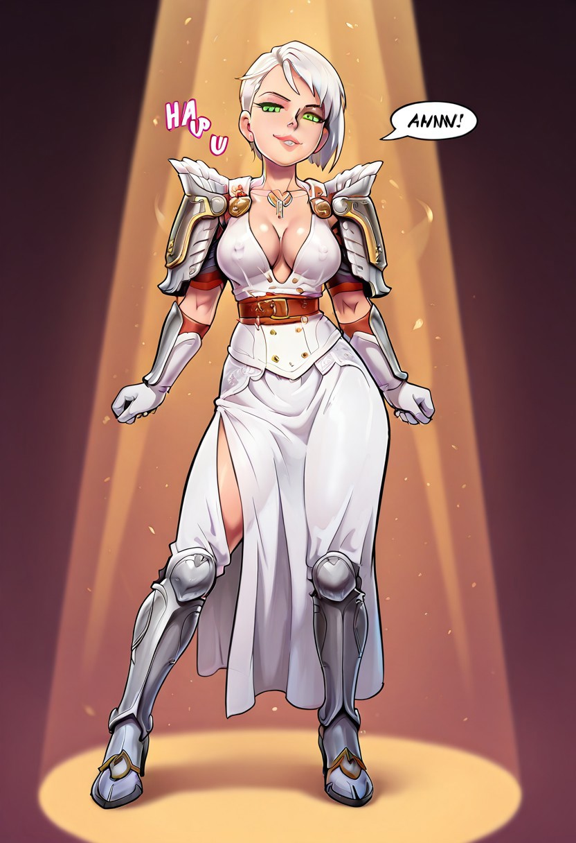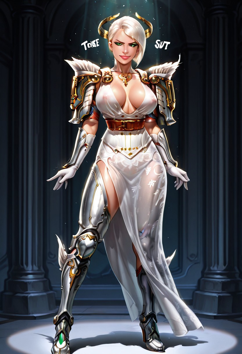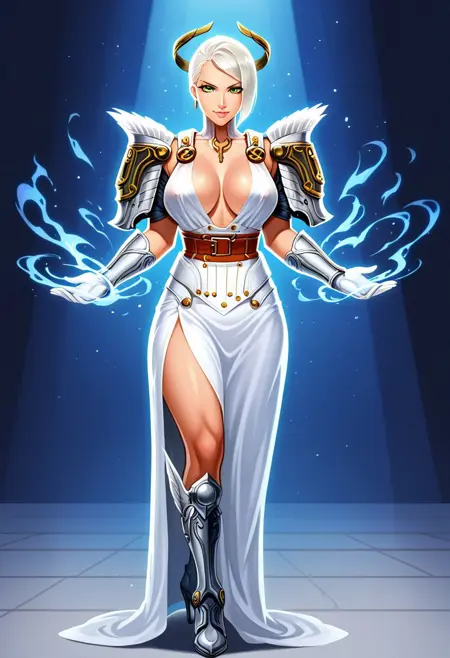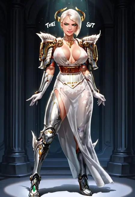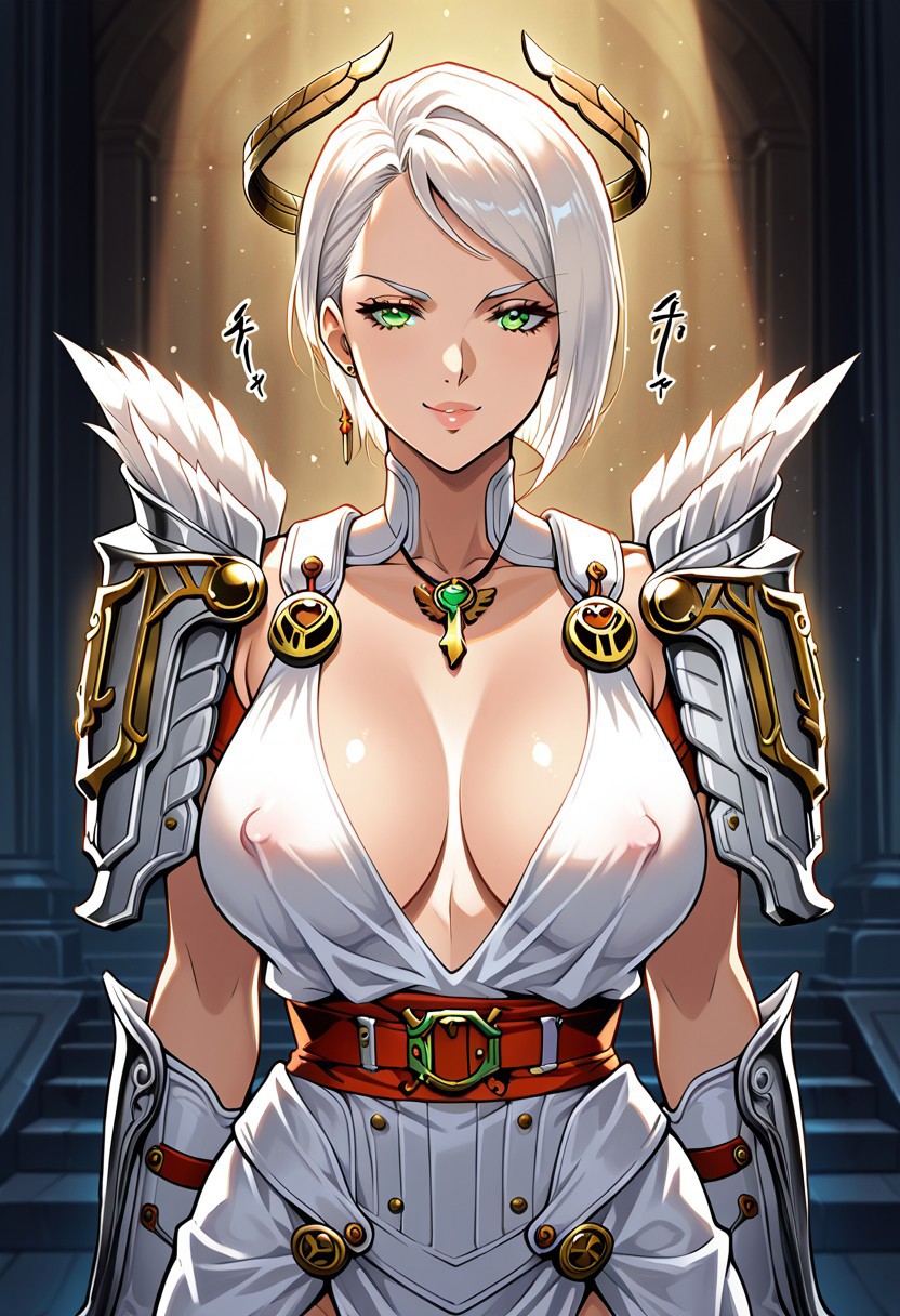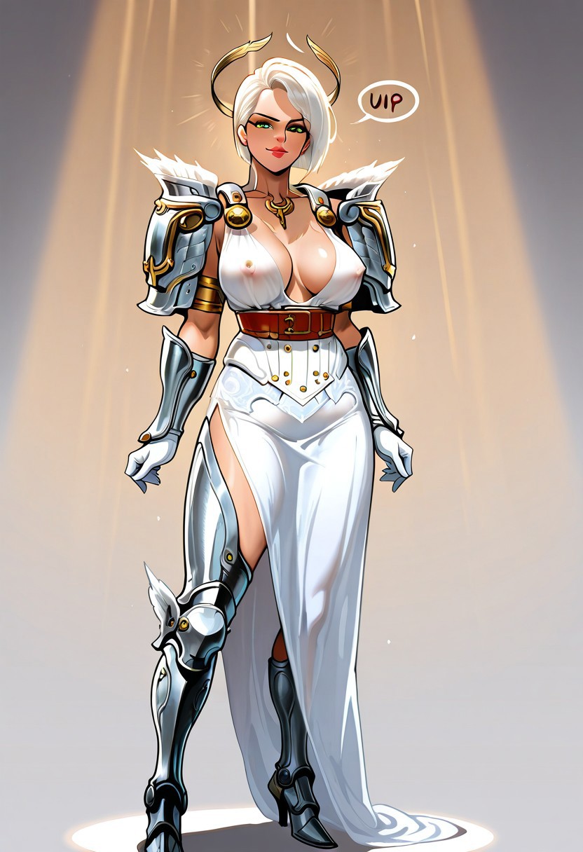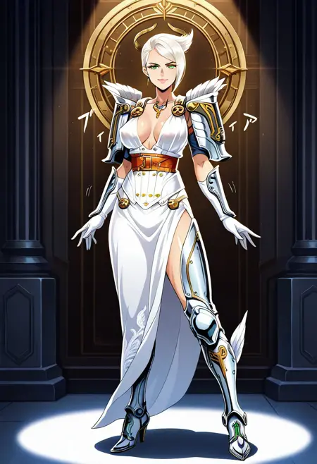 IannaSF, 1girl, solo, muscular woman, goddess, white hair, short hair, green eyes, lips, gold nimbus, glowing eyes, armor, necklace, shoulder armor, pauldrons, cleavage, large breast, white dress, dress ornament, red sash, buttons, transparent white skirt, white panty, underwear, white gloves, wide hips, high heels, over the knee boots heels, armor boots,