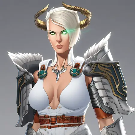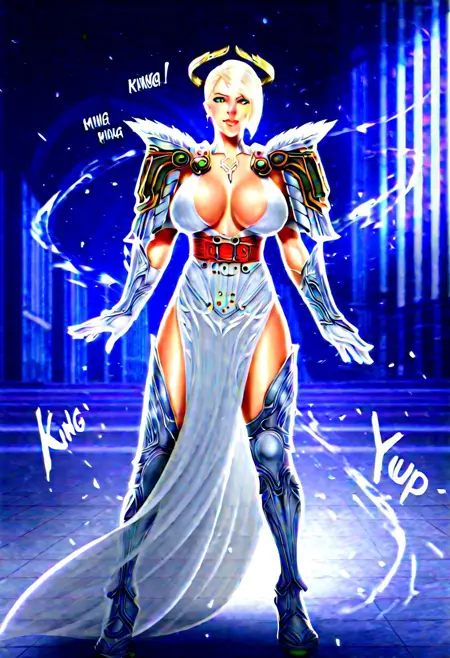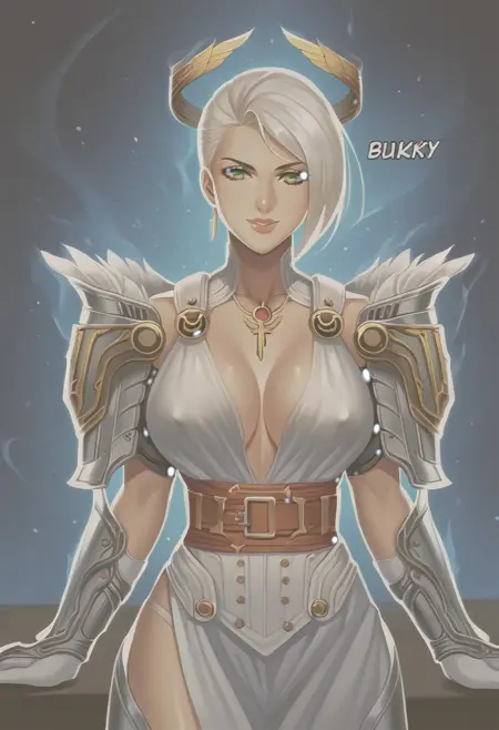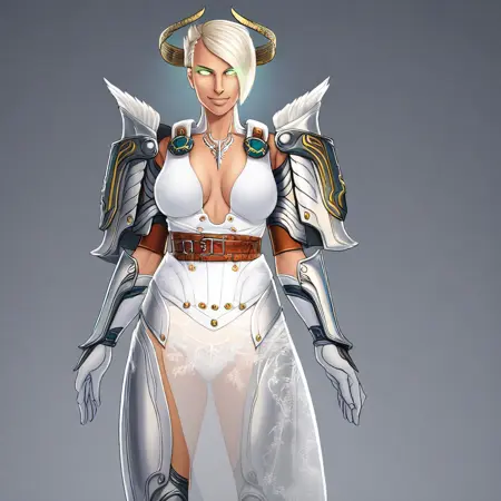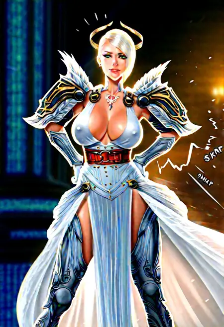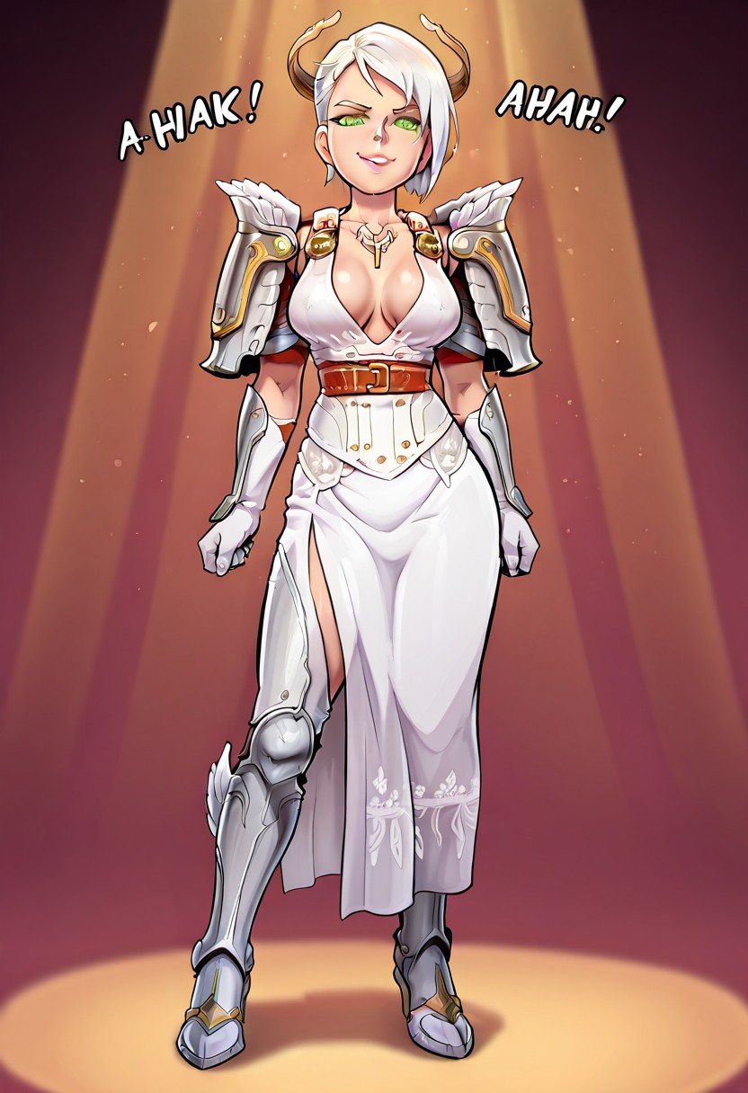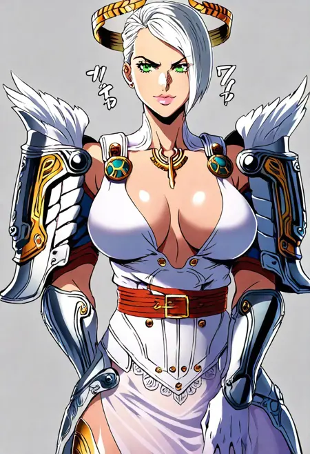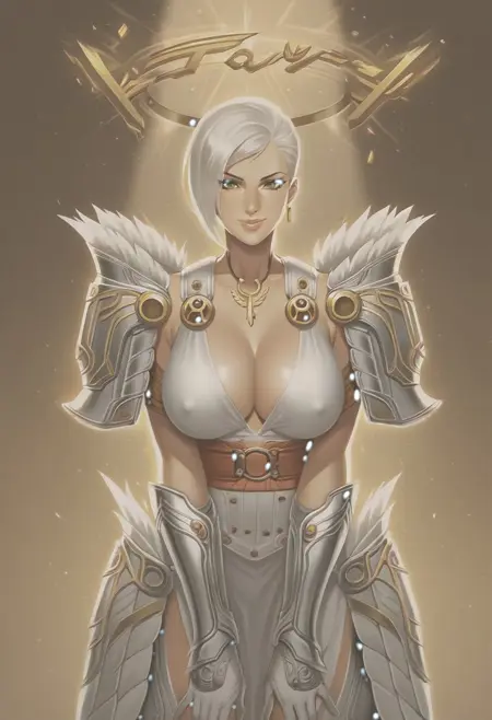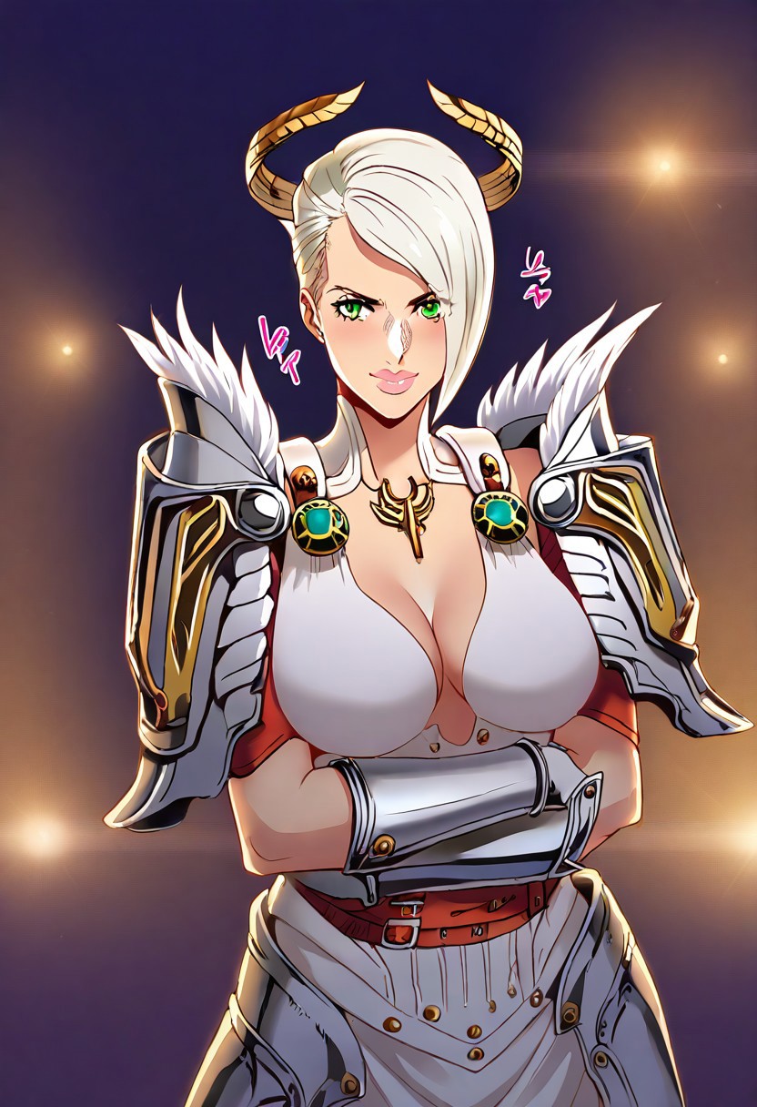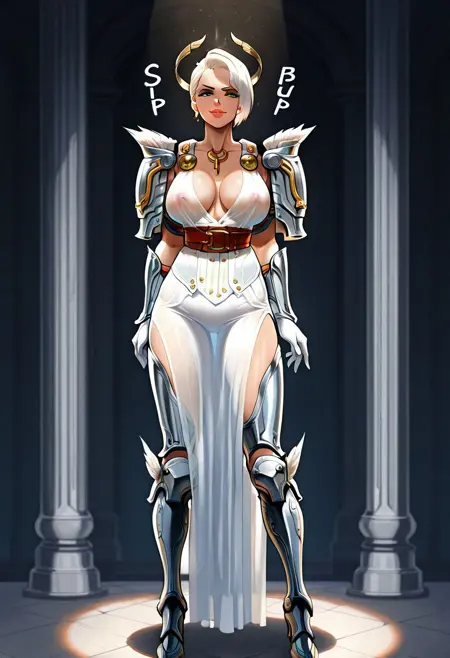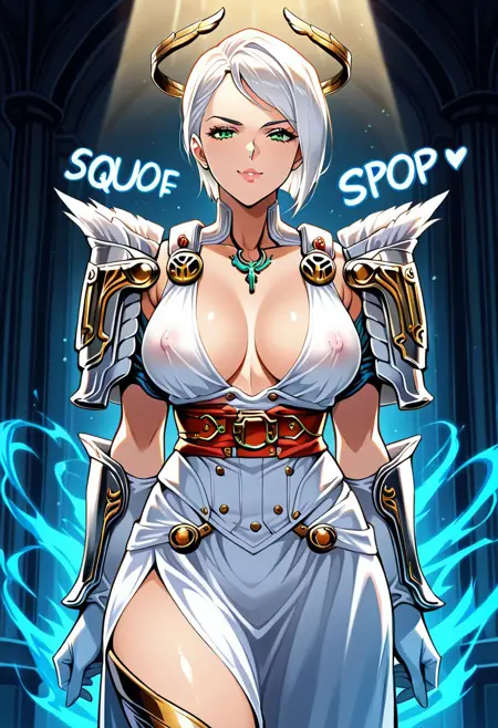IannaSF, 1girl, solo, muscular woman, goddess, white hair, short hair, green eyes, lips, gold nimbus, glowing eyes, armor, necklace, shoulder armor, pauldrons, cleavage, large breast, white dress, dress ornament, red sash, buttons, transparent white skirt, white panty, underwear, white gloves, wide hips, high heels, over the knee boots heels, armor boots,