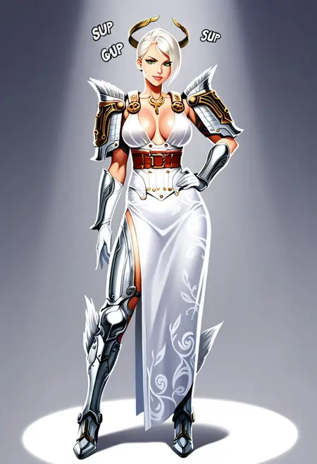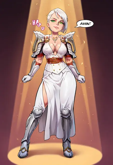IannaSF, 1girl, solo, 筋肉質な女性, 神々, 白髪, 短髪, 緑の目, 唇, 金色の光輪, 輝く目, アーマー, ネックレス, 肩アーマー, パウルドロン, 胸元, 大きな胸, 白いドレス, ドレスの装飾, 赤い帯, ボタン, 透け感のある白いスカート, 白いパンティ, 下着, 白い手袋, 広い臀部, ハイヒール, 太ももより上のブーツヒール, アーマーブーツ,