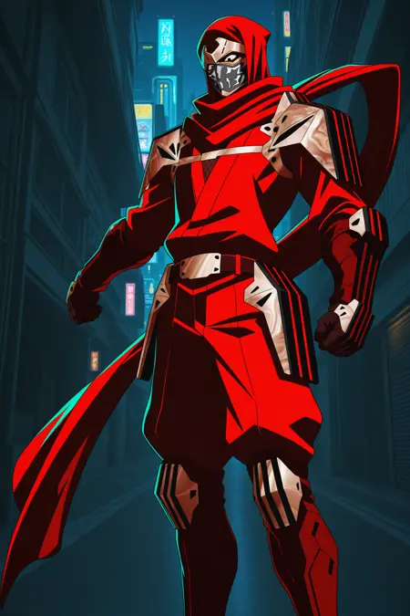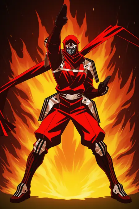 fujikido kenji, black eyes, long sleeves, ninja, ninja mask, menpoo, long scarf, red scarf, hood, red shirt, japanese armor, pauldrons, gloves, belt, red pants, knee boots, armored boots