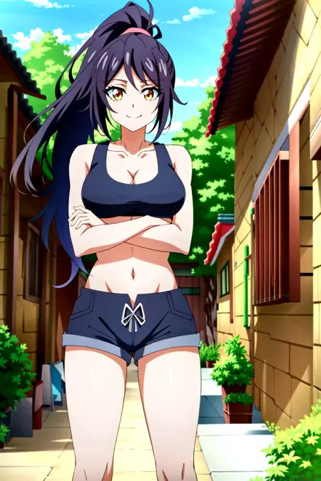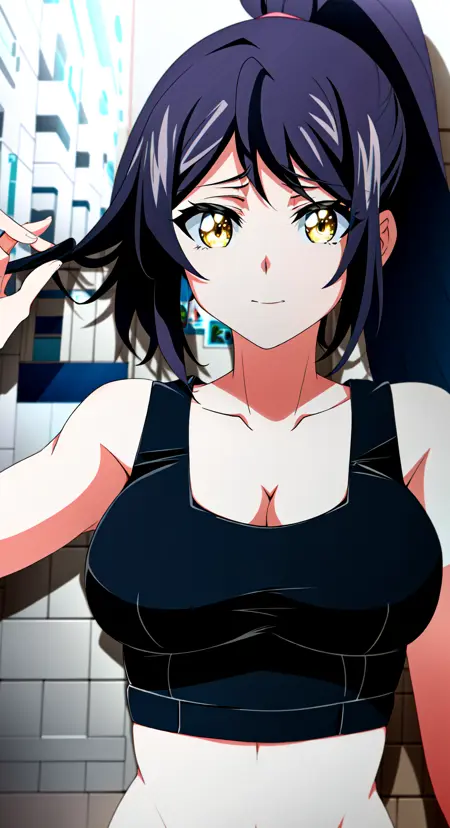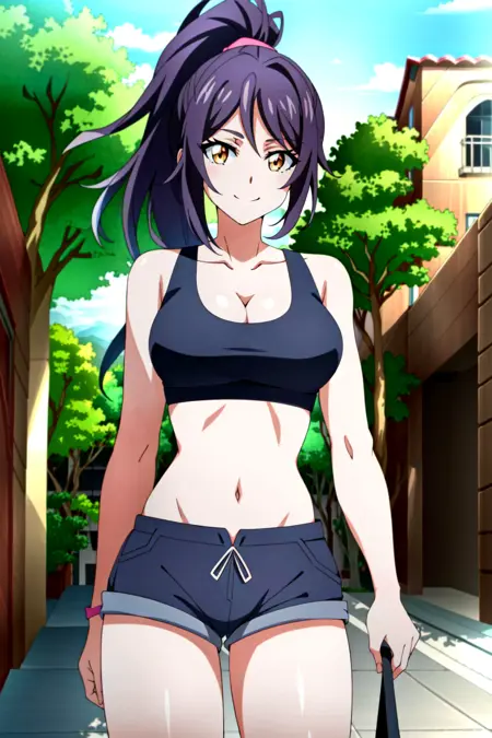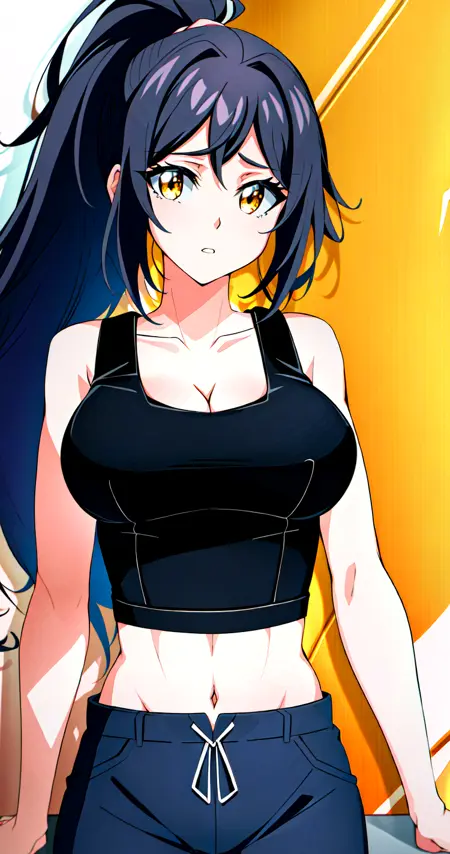 당현, 1girl, solo, breasts, long hair, shorts, cleavage, white background, full body, yellow eyes, basketball, simple background, midriff, large breasts, navel, sneakers, ponytail, high ponytail, shoes, looking at viewer, socks, black hair, standing, sports bra, very long hair, wristband